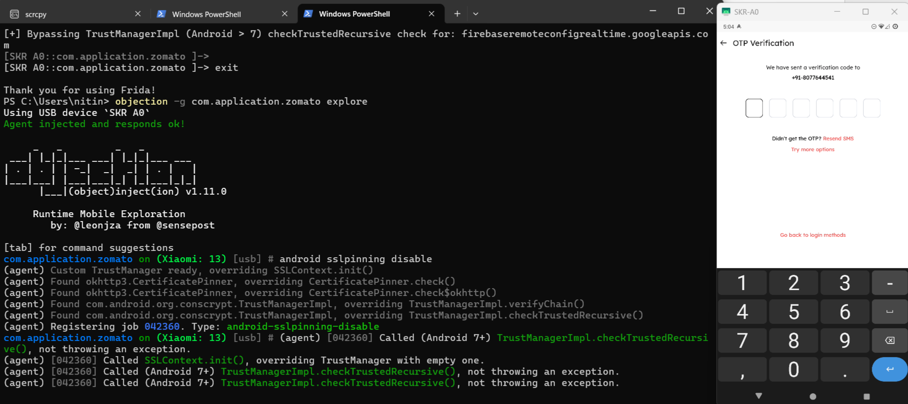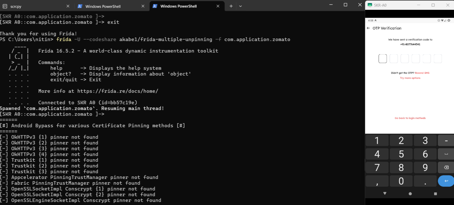 In the image below, you can see Frida script execution in the Zomato application.