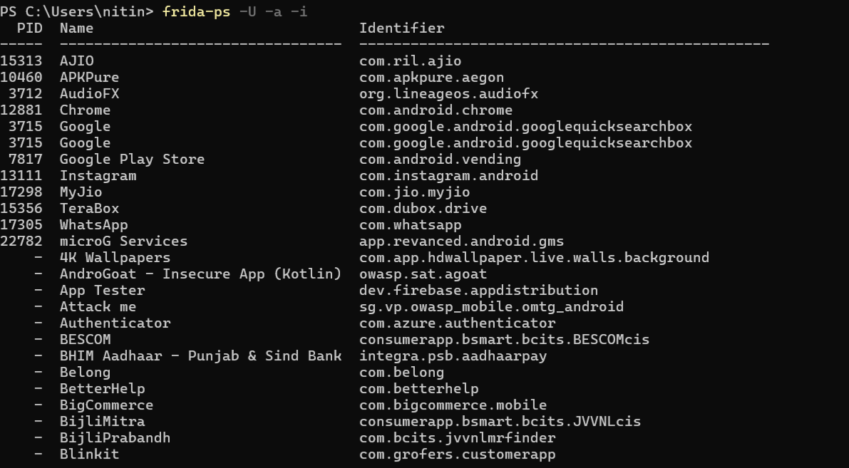 frida-ps -U -a -i