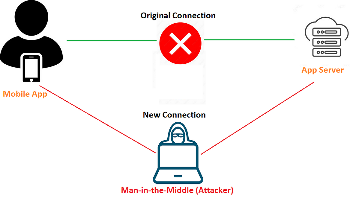 In the illustration above, rather than sending requests directly to the app server, we position ourselves in the middle to intercept the traffic. However, if we attempt to intercept this communication without first bypassing SSL pinning, the application may either crash or display an error message such as "No Internet Connection."